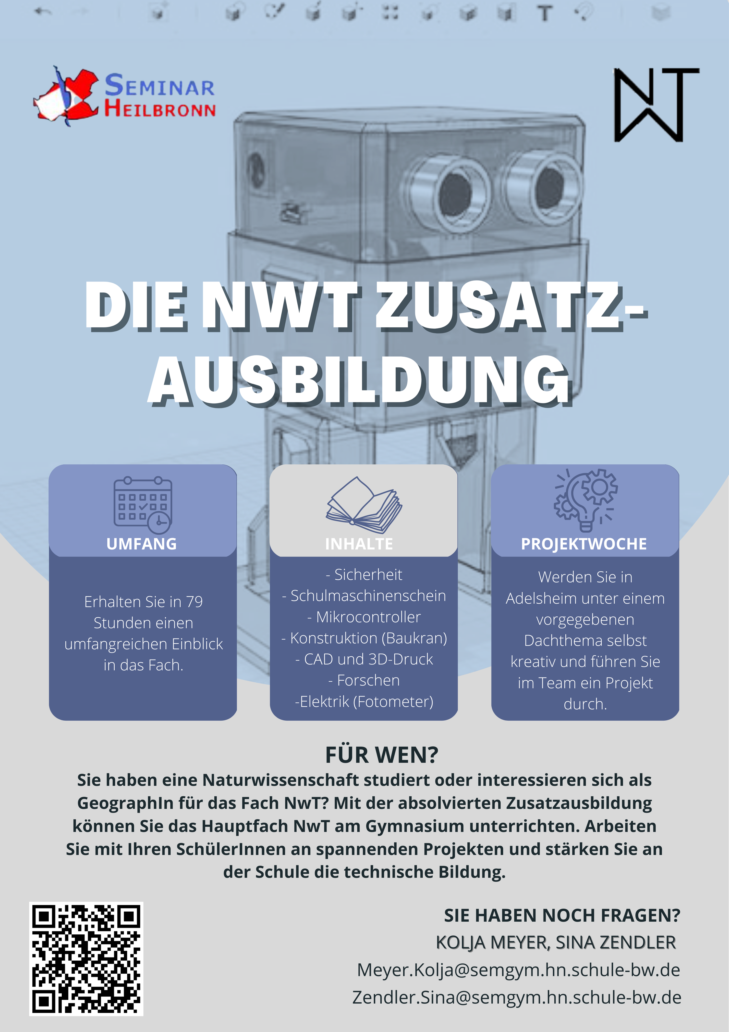 Sie haben eine Naturwissenschaft studiert oder interessieren sich als Geographin oder Geograph für das Fach NwT? Mit der absolvierten Zusatzausbildung können Sie das Hauptfach NwT am Gymnasium unterrichten. Arbeiten Sie mit Ihren Schülerinnen und Schülern an spannenden Projekten und stärken Sie an der Schule die technische Bildung.