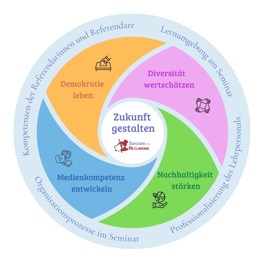 Daher setzt sich das Seminar Heilbronn (Gymnasium) als Ziel, sich in diesen Zukunftsthemen in der Ausbildung, der eigenen Professionalisierung, den seminarinternen Organisationsprozessen sowie der Lernumgebung weiterzuentwickeln. Aufbauend auf dem Leitbild von 2008 nimmt ein neues gemeinsames Entwicklungsleitbild, das die Seminarkonferenz 2025 beschlossen hat, diese Handlungsfelder .besonders in den Blick.