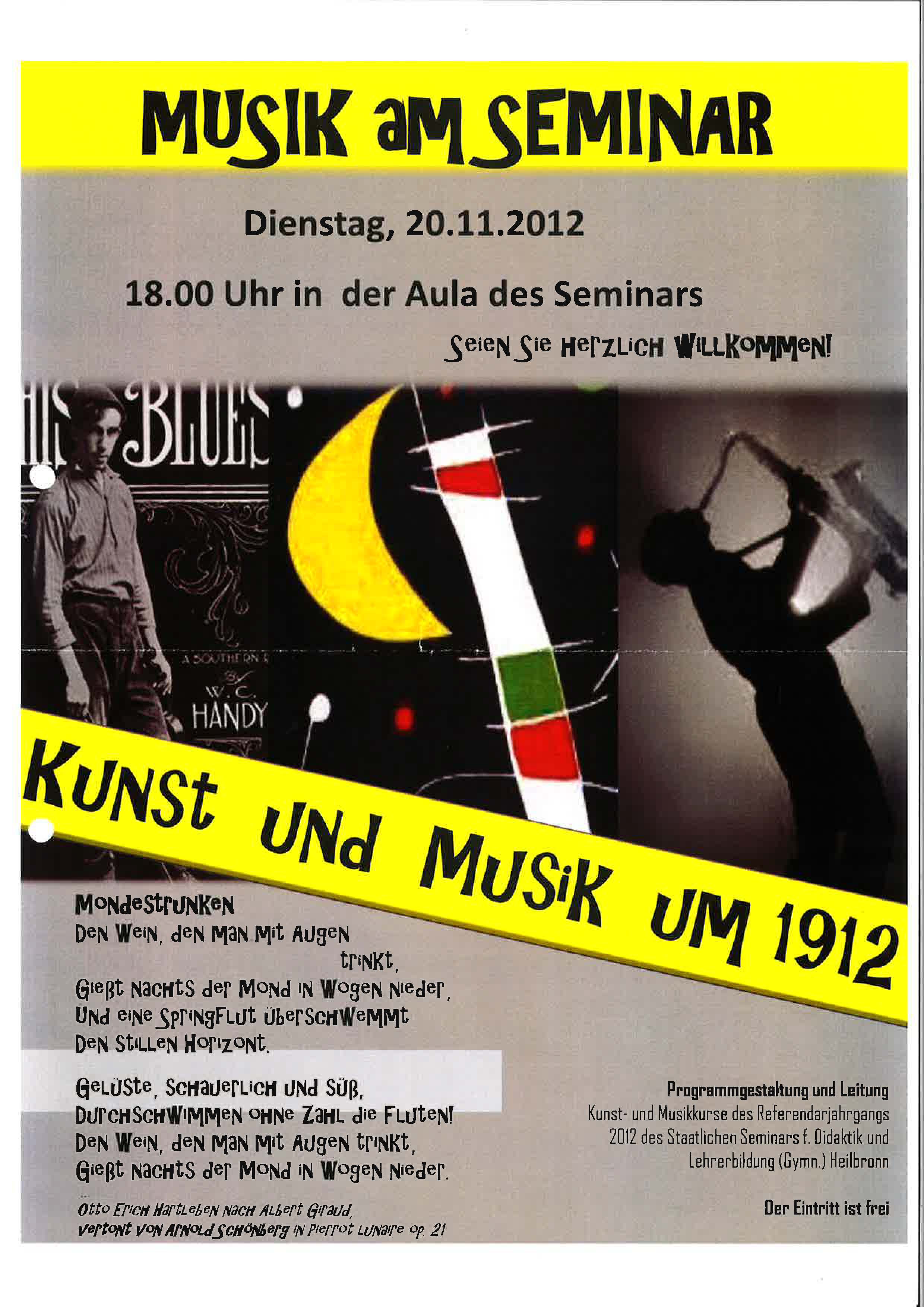 Unter diesem Motto gestalten unter anderem die Musikkurse zusammen mit Referendarinnen und Referendaren sowie Dozentinnen und Dozenten anderer Fachschaften (z.B. mit Bildender Kunst oder Geschichte) einmal jährlich ein Konzert.